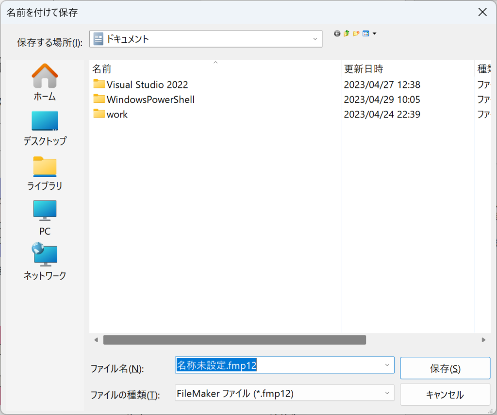 今回は、ドキュメントフォルダに名称未定.fmp12ファイルを作成しています。