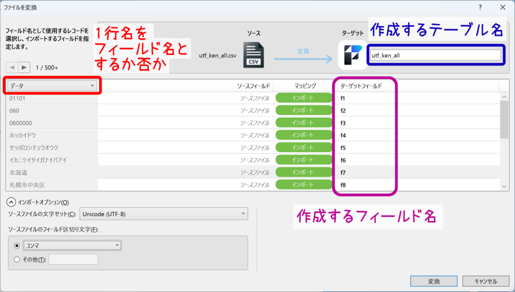 郵便番号データはタイトル行がありません。そのため、フィールド名は左から順にf1、f2、f3・・・と自動で設定されます。すこし手間ですが、あとで変換できるのでそのまま変換ボタンを押しましょう!