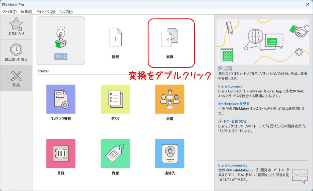 今回はすでにあるデータをFileMakerに変換するので、「変換」ボタンをダブルクリックします