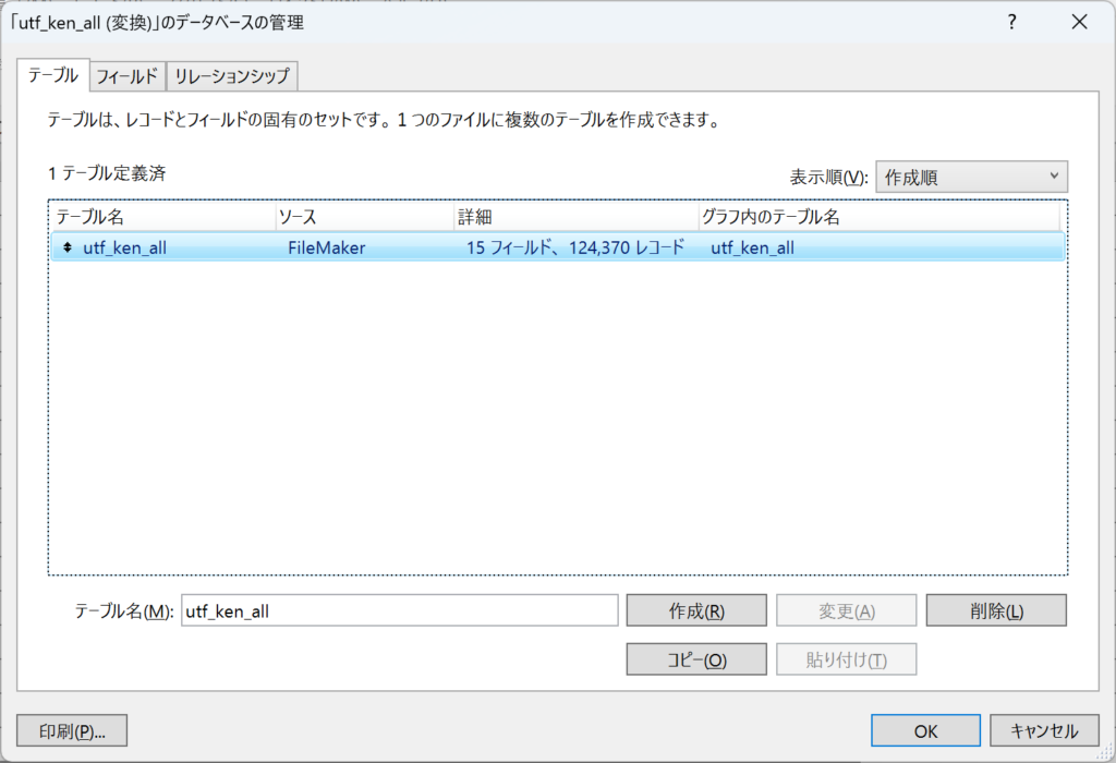 今回は、utf_ken_allという名前で、テキストフィールドが15個あるテーブルが作成できました