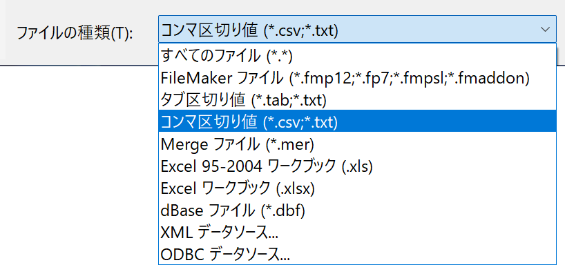 今回はCSVファイルなのでファイルの種類に「コンマ区切り値」を選択していますが、ExcelからもFileMakerファイルに変換が可能です